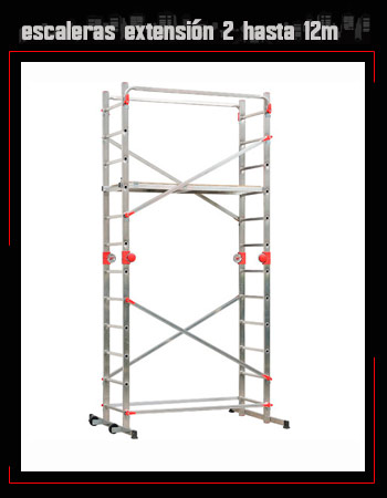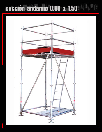 Equipo metálico tubular para trabajar en altura. Cada sección sube 1,50 mts. Y ocupa un área en la base de 0,80 mts. de ancho hasta 1,80 mts. de largo.